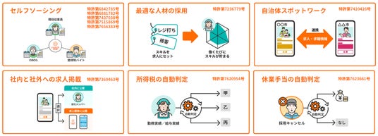 当社は現在、スポットワークおよび「セルフソーシング」に関する特許を国内外に30件以上出願しており、基本特許を含む15件の特許を取得済みです。特許テーマは大きく分けて、セルフソーシング、コンプライアンスの遵守、最適な人材との最大のマッチング、自治体のスポットワークの4つのポートフォリオがあります。スポットワークの根幹だけでなく、マッチングの最適化による効率化、労働者保護、地方創生も意識した技術開発を行っています。