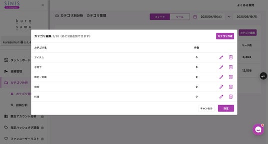 1投稿に最大5つまで任意のカテゴリを付与でき、「キャンペーン別」、「商品別」、「ターゲット別」、などテーマに応じた分類が可能です。カテゴリは最大10件まで設定できます。