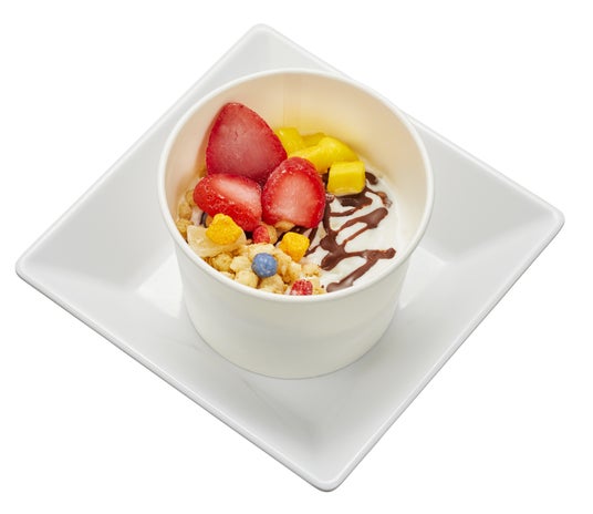 甘さ控えめで、酸味が際立つひんやりヨーグルトアイスに、グラノーラと冷凍イチゴなどのフルーツをトッピングした爽やかなデザート。