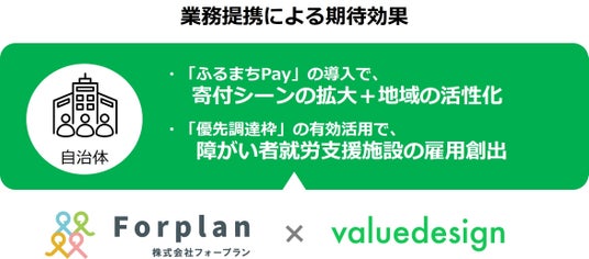 障がい者就労支援施設をフランチャイズ展開する株式会社フォープラン(本社:愛知県名古屋市、代表取締役社長:内田 直希、以下「フォープラン」)、ペイクラウドホールディングス株式会社(東証グロース:4015)の傘下でキャッシュレスサービス事業を展開する株式会社バリューデザイン(本社:東京都中央区、代表取締役社長:林 秀治、以下「バリューデザイン」)は、バリューデザインが提供する現地決済型ふるさと納税サービス「ふるまちPay」の全国の自治体へのさらなる拡販と、障がい者の雇用創出の促進を目指し業務提携することをお知らせします。