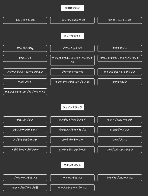 有酸素マシン、ウェイトスタック、フリーウェイトといった多彩なマシンを40台以上完備しています。ジム初心者でも使いやすいことはもちろん、ジム上級者の方でも、十分にトレーニングできる本格マシン設備を整えています。