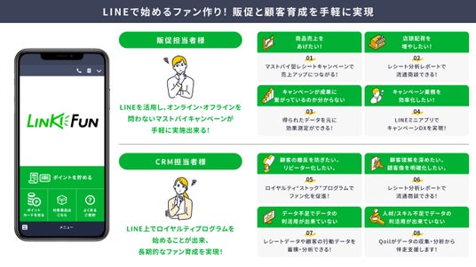 「LINKFUN」とは、企業とユーザーがLINEミニアプリ上で繋がり、オンライン・オフライン問わずキャンペーンや継続的なロイヤルティプログラムをカンタンに行え、ユーザー分析も出来る販促・顧客育成ツールです。販促視点ではマストバイ型キャンペーンによる売上アップやデータによる効果測定・流通商談機会創出、LINEミニアプリによるキャンペーンDX等を、CRM視点ではファン化の促進や行動データの収集・分析による顧客の見える化および顧客体験の向上などを実現します。