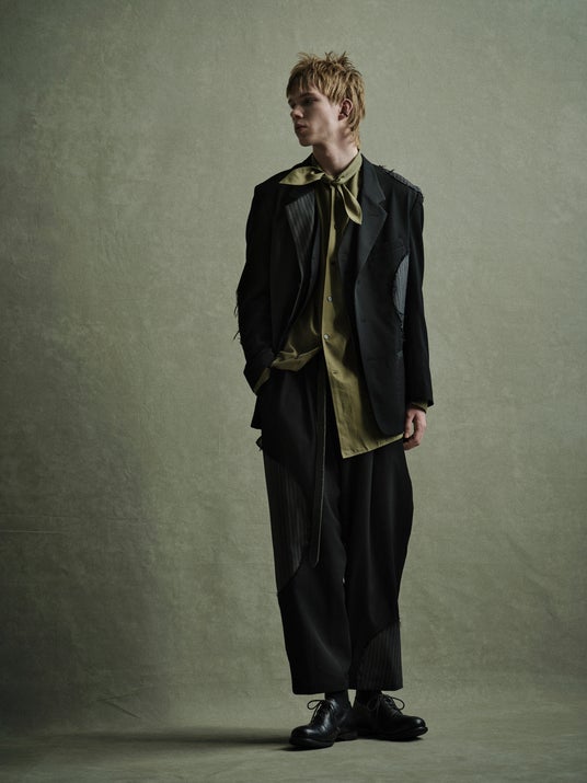 ナチュラルなムラ感を表現したタンガリー素材の2ツ釦テーラードジャケットとパンツ。パンツはベルトループを兼ねた側章が付いており、釦で留め外し可能なデザインです。オーバーサイズの台襟付きシャツは、インド織機の独特な風合いと菊と靄(もや)のモチーフを掛け合わせた刺繍で大きく「y」を表現しました。