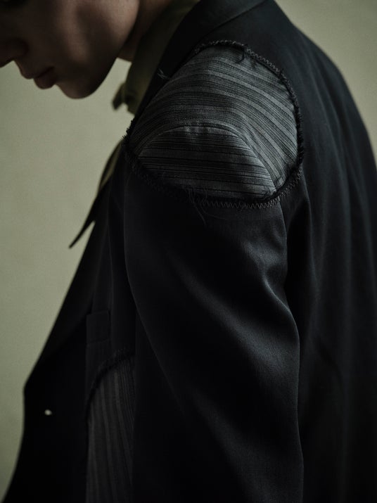 洗い晒しのような天日風合い加工の生地に、身頃に丸くカットアウトを入れたテーラードジャケットと2タックパンツ。切り替え部分にストライプの生地を使用する事で、クラシックな形でありながらも遊び心を加えたルックです。
