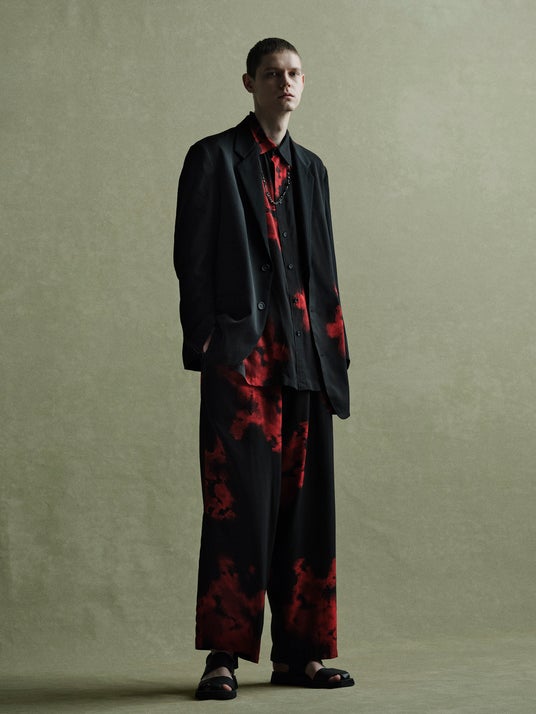 前身頃が左右段違いとなっているジャケット、軽やかなドレープのシャツとパンツには燃え上がる火をイメージしたモチーフをインクジェット捺染で全面にプリントした総柄のルックです。