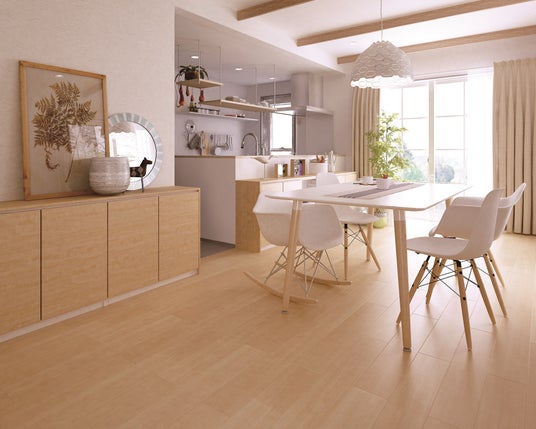標準仕様で床暖房に対応※しており、熱による変形が起こりにくいほか、プラスチックキャスター等による凹み傷や擦り傷にも強く、機能性に優れています。また、MDFの単層基材を用いたことで、床暖房対応の上張り床材という性能を備えつつも、高いコストパフォーマンスを実現しました。