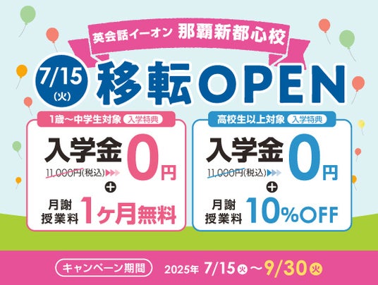 英会話教室を運営する株式会社イーオン(本社:東京都新宿区、代表取締役社長:重野卓、以下「イーオン」)は、2025年7月15日に現在の「イーオン那覇国際通り校」を移転し「イーオン那覇新都心校」としてオープンいたします。