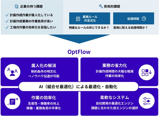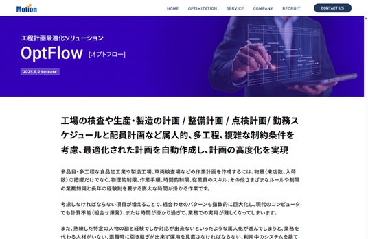 株式会社モーション(本社:東京都文京区、代表取締役:上杉顕一郎)は、工場の検査や生産・製造の計画 / 整備計画 / 点検計画/ 勤務スケジュールと配員計画など、最適化された計画を自動作成し、計画の高度化を実現する工程計画最適化ソリューション「OptFlow(オプトフロー)」の提供を開始いたします。同サービスは、当社がこれまで蓄積した「組合せ最適化」のノウハウを元に企業の持つ課題と技術的課題を考慮した解決方法を検証し、自社開発エンジンを中心に課題に合わせてエンジンを選択するなど、柔軟に対応できます。