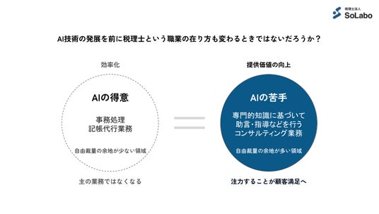 昨今のAI技術の進化により、税務に関する記帳業務をはじめ、事務処理業務は圧倒的に「効率性」「生産性」を高めることが可能となりました。この技術によって従来業務にかける時間削減と共に、税務や会計を軸とした顧客の成長を生み出すことに、新たな価値創造があると考えるようになりました。