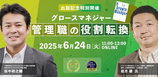 このたび当協会は、代表理事/法政大学キャリアデザイン学部 教授・田中研之輔の新刊『グロースマネジャー:新任管理職のキャリア開発』の出版を記念し、同書の共同著者であるソフトバンク株式会社 コーポレート統括 人事総務 本部 採用・人材開発統括部 人材開発部 部長 岩月優氏とともに、オンラインイベント「グロースマネジャー:管理職の役割転換」を6月24日(火)11:00より開催いたします。