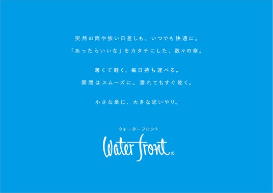 1986年創業の傘ブランドWaterfrontは、累計販売本数2億本超え老若男女、さまざまなライフスタイルの中でご愛用いただいています。現在まで常に独自の高い機能を追求し、また手頃な価格でお客様の多様なニーズに応えてきました。中でも持ち運びのしやすさに特化した薄型傘「ポケフラット」は累計販売本数2,400万本を超える代表商品です。2025年は株式会社ウォーターフロントに社名変更したことも あり、傘ブランドWaterfrontの新たな魅力を発信していきます。