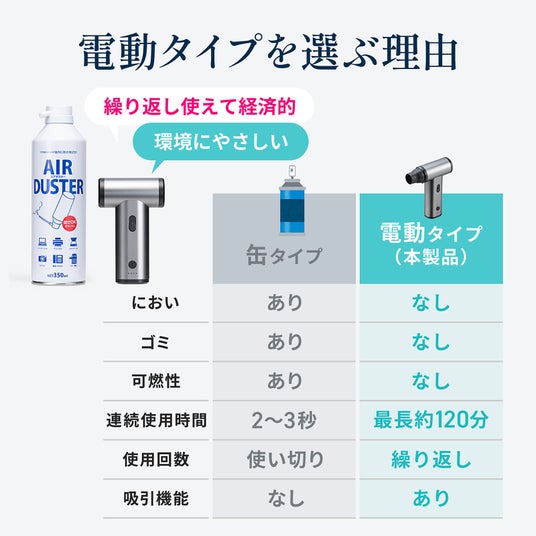 本体は充電式で繰り返し使用することが出来ます。缶タイプのエアダスターに比べ繰り返しの購入やゴミ捨てや火気による危険性などが無く、経済的で地球にやさしいです。