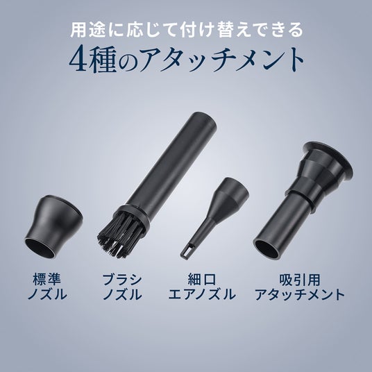 小型ながら最大風速30m/sでホコリやゴミを吹き飛ばすことができ、風量は無段階で調整が行え、4種類のアタッチメントを付け変えて使える電動エアダスター