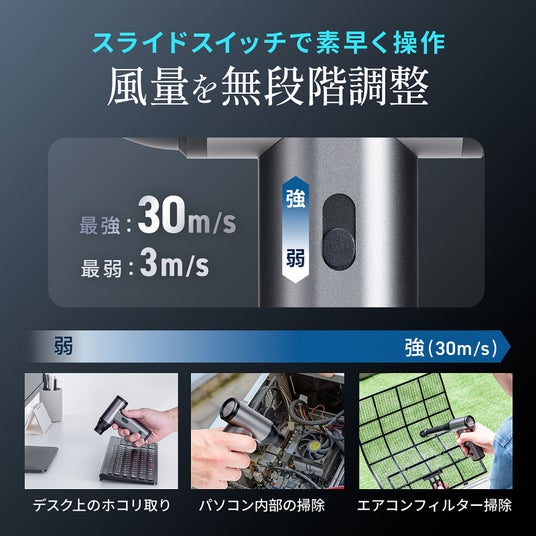 最大風速30m/sに対応。キーボードの隙間掃除はもちろん、無段階で調整が行えるため精密機器やエアコン、車内にシュレッダーなど様々な場所を掃除することが出来ます。また、本体は持ちやすいガンタイプでどの向きでも使用することができ、逆さ噴射にも対応しています。