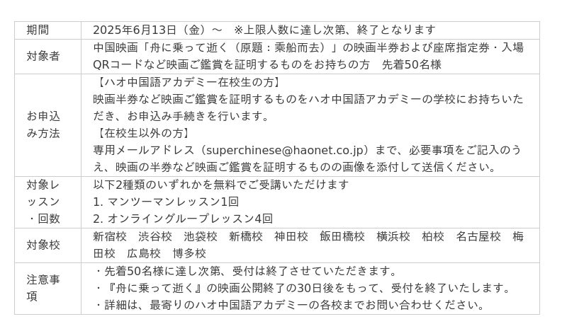 2025年6月13日(金)より公開される『舟に乗って逝く』を映画館でご覧になり、映画半券および座席指定券・入場QRコードなど映画ご鑑賞を証明するものをハオ中国語アカデミーの学校にお持ちいただくことで、先着50名様にハオ中国語アカデミーのマンツーマンレッスン1回もしくはオンライングループレッスン4回を無料でプレゼントいたします。