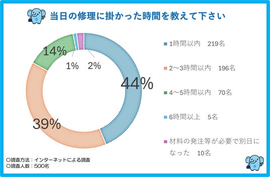 2時間以上かかった作業の合計が271名で54.2%となりました。先の項目で、蛇口の修理で一番時間のかかりそうな蛇口本体交換が112名だったので、それが全て2時間以上かかったとしても残りの159名は部品交換で2時間以上かかったことになります。