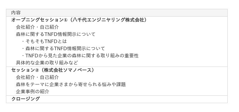 八千代エンジニヤリング株式会社(本店:東京都台東区、代表取締役社長執行役員:高橋 努)は、株式会社ソマノベース(本部:和歌山県田辺市、代表取締役:奥川 季花)が主催する「サステナ担当者必見!TNFDから見た企業の森林保全活動について(6月18日(水)開催)」と題したセミナーに登壇します。
