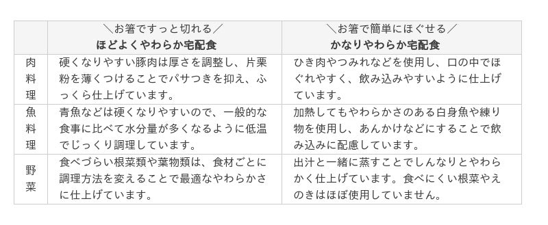 私たちはその気持ちに寄り添い、やわらか食を購入する際に直面する課題を解決するために、「ほどよくやわらか宅配食」と「かなりやわらか宅配食」の2種類をセットにしました。実際に食べ比べていただくことで、ぴったりのやわらかさを見つけていただけます。
