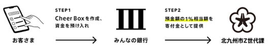 「北九州市Z世代課」を含む名前を付けたCheer Boxにお金を預けることで、応援する“あなた”に代わり、みんなの銀行がCheer Boxに集まった預金残高の1%相当を北九州市Z世代課に寄付します。支援金は、Z世代はみ出せコンテスト受賞者のプロジェクト運営費に充てられます。