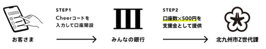 口座開設時にCheerコード「KitakyuZ」を入力すると、支援金として500円がみんなの銀行から北九州市Z世代課に届き、さらには応援特典として開設された方の口座(貯蓄預金)に500円がプレゼントされます。