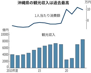 沖縄県が発表した2023年度の観光収入(試算値)は、前年度比21.3%増の8507億円で過去最高となった。これまで最も多かった新型コロナウイルス禍前の18年度(7340億円)と比べて15%超増えた。観光客数が前年度比25%超増の853万人あまりとなり、うち国内客が726万人あまりと過去最多だったことが寄与した。(日経新聞2024.8.23)