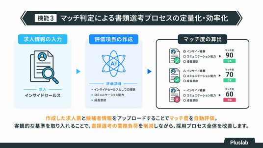Pluslab社はこうした採用の課題に対して、AIエージェントを活用することによって採用要件の設計と実行プロセスを効率化し、採用担当者がより本質的な課題に向き合えるようサービスを展開していきます。