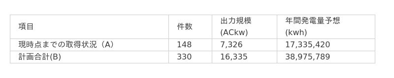 2025年5月30日時点においては148箇所(7.326MW-AC)の取得をしており建設を進めており、残り182箇所(9.009MW-AC)の取得に向けて、2025年12月末までの取得を目途に、複数の事業者に要請を行い取得を目指しております。