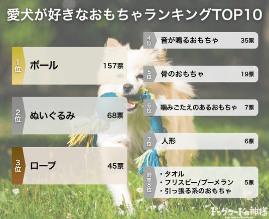 アンケートを行ったところ、「ボール」が最も人気のおもちゃとして157票を集めました。2位以下には「ぬいぐるみ」や「ロープ」など、くわえたり振り回したりしやすい遊び道具が続きます。