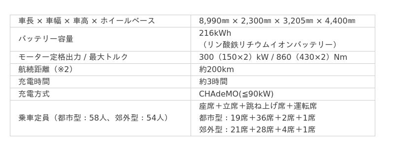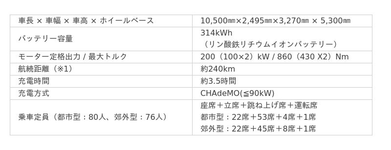 BYD電気バスの出展車両の詳細※1は以下の通りです。