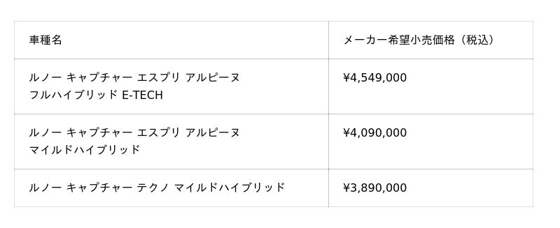 ルノー・ジャポン株式会社(所在地:神奈川県横浜市、代表取締役社長兼CEO:大極 司)は、エレガントでテクノロジー感覚あふれるフロントマスク、スポーツシックで上質なインテリア(エスプリアルピーヌ)、輸入車SUV No.1*1の燃費性能を持つフルハイブリッド E-TECHと、力強い走りと低燃費を両立したマイルドハイブリッドのふたつのハイブリッドパワートレーン、そして新機能を追加した豊富な運転支援システムなど、機能と装備が大きく向上した新型ルノー キャプチャー(マイナーチェンジモデル)を、6月12日(木)から、全国のルノー正規販売店で販売します。