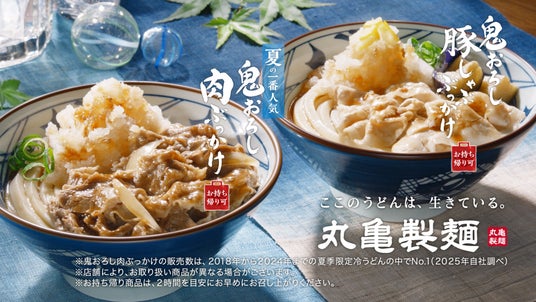 2025年6月10日(火)より、麺職人※1が毎日粉からつくる、打ち立て、茹でたてを水できゅっと締めた冷たいうどんに、シャキシャキの鬼おろしと食べ応え抜群のお肉を乗せた、丸亀製麺の夏の定番「鬼おろしシリーズ」が、今年も帰ってきます。新TVCM 丸亀製麺「やっぱりこれこれ!鬼おろし肉&豚しゃぶぶっかけ」篇では、夏の一番人気商品※2『鬼おろし肉ぶっかけうどん』、ひんやり、さっぱり豚しゃぶの『鬼おろし豚しゃぶぶっかけうどん』が登場します。