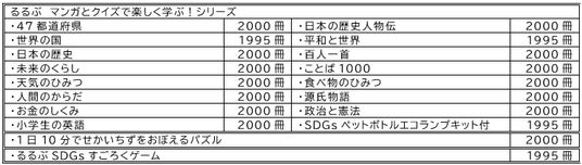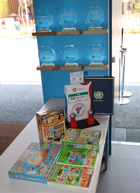 JTBは国連パビリオンを訪れた子どもたちの好奇心や探求心の高まりの一助となるよう、子どもたちが大好きな「マンガ」と「クイズ」によるわかりやすい内容で、子どもが自ら楽しく読み進められるよう編集した「るるぶ マンガとクイズで楽しく学ぶ」シリーズを中心に、19種、約36,000冊を寄贈しました。これらの書籍は国連パビリオンに訪れた子どもたちを対象に提供されます。