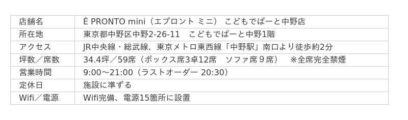 「È PRONTO」とは、イタリア語で「準備OK」「ご飯できたよ」という家庭的な言葉。様々な人々が行き交い、好きな時に好きなだけ時間を過ごす場所。程良く気持ち良く、誰もがとけ込めるカフェ。あらゆる人々の心と生活に心地よくフィットする、とっておきの“自分の場所”として一日中お好きなシーンで寛ぎの時間をお過ごしいただけます。『È PRONTO(エプロント ミニ) mini こどもでぱーと中野店』は『È PRONTO』の魅力をそのままに、こどもも大人も楽しめる空間を提供して参ります。