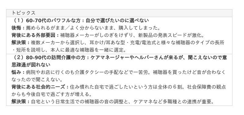 5年間、500名のお客様にお会いする中で、現代の高齢者の聞こえの問題に対する悩みが多様化していることが見えてきます。