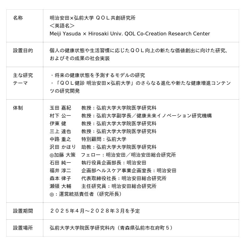株式会社明治安田総合研究所(代表取締役社長 森本 律子、以下「明治安田総合研究所」)および明治安田生命保険相互会社(執行役社長 永島 英器、以下「明治安田」)は、国立大学法人弘前大学(学長 福田 眞作、以下「弘前大学」)と、2025年4月1日付で、「QOL(注1)の向上」をめざす研究に取り組む「明治安田×弘前大学 QOL共創研究所(Meiji Yasuda × Hirosaki Univ. QOL Co-Creation Research Center)」(以下、「当研究所」)を設置したことを、お知らせいたします。