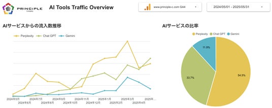 株式会社プリンシプル(本社:東京都千代田区、代表取締役:楠山 健一郎、以下「プリンシプル」)は、ChatGPT、Gemini、Perplexityなどの主要AI関連サービスからの自社サイトへの流入をモニタリングできる無料ダッシュボードを公開しました。