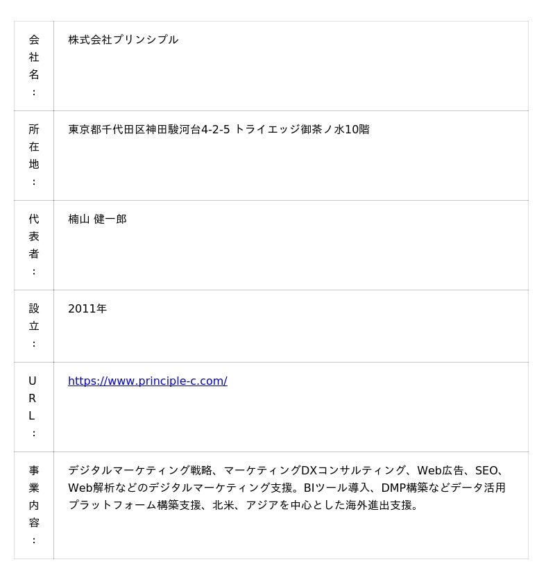 株式会社プリンシプルは、デジタルマーケティングの戦略立案から施策実行までをワンストップで提供するDXパートナーです。クライアントのビジネス成長を支援するために、最新のマーケティング手法と技術を活用し、最適なソリューションを提案しています。