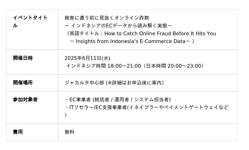 国内導入実績No.1※1の不正検知サービスを提供し、安全なネット通販のインフラづくりに貢献するかっこ株式会社(本社:東京都港区、代表取締役社長 : 岩井 裕之、証券コード:4166、以下 Cacco)は、東南アジア向けプレスリリース発信プラットフォームを運営する株式会社VRITIMES(本社:東京都新宿区 CEO:Ferry Bayu Nirwono)と共催で、EC事業者及びITリセラーなどを対象としたビジネス交流会「被害に遭う前に見抜くオンライン詐欺 - インドネシアのECデータから読み解く実態(英語タイトル:How to Catch Online Fraud Before It Hits You -Insights from Indonesia's E-Commerce Data.)」を2025年6月11日(水)インドネシアにて開催することをお知らせします。