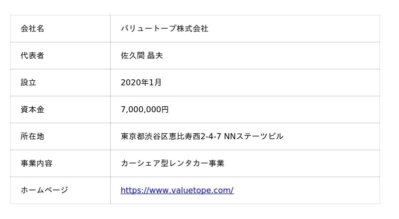 モビリティ分野において、無人・非対面の24時間レンタカーサービス「オールタイムレンタカー」を展開するバリュートープ株式会社(本社:東京都渋谷区、代表取締役:佐久間晶夫、以下「当社」)はこのたび、i-nest capital(リードインベスター)が運営するi-nest2号投資事業有限責任組合および株式会社イードを引受先とするシリーズAラウンドの第三者割当増資に合意し、総額1億円の資金調達契約を締結しましたことをお知らせいたします。