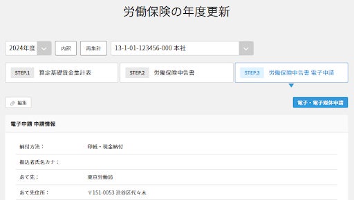『ジョブカン給与計算』の「労働保険の年度更新」画面に「電子申請」ステップが加わり、これをクリックするだけで『ジョブカン労務HR』側の電子申請準備が完了します。