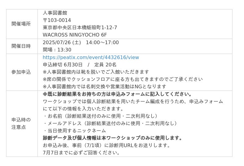 【7月26日(土)】組織を動かす“個性のちから”を知る!FFS理論体感ワークショップを開催|東京 人形町@人事図書館