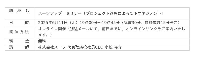 当社では、2025年6月11日(水)19時から、当社代表の小松が講師を務めるスーツアップ・セミナー「プロジェクト管理による部下マネジメント」を無料開催します。