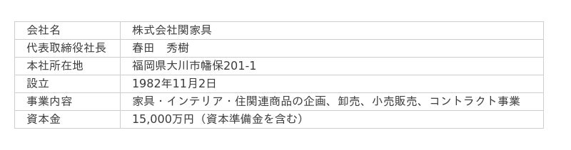 家具の生産地、福岡県大川市にある家具の総合商社です。全国の家具店やインテリアショップ、通販会社などへの一般家庭向け家具の卸販売、ホテル、レストランなどの飲食店、ハウスメーカーや工務店、オフィスへの家具インテリアの提供や空間設計の他、関家具大川本店やCRASH GATE、アトリエ木馬の店舗も運営。新しいライフシーンを創造し、人々に幸せと感動を提供するという企業理念のもと、商品企画・開発に注力し、オリジナルブランドを多数展開しています。