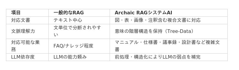 Archaic RAGはこれらを包括的に扱うことで、回答の網羅性・正確性を飛躍的に向上させています。