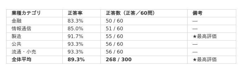 このベンチマークは、5業種(金融・情報通信・製造・公共・流通・小売)における業務想定のQ&Aペア(各60問、計300問)から構成されており、