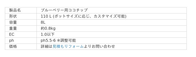 南インドに自社工場を有する当社は、栽培作物に応じたココピート製品を開発し、生産者の方々へとご提供してまいりました。この度、新たにブルーベリー生産者の方からのご要望にお応えして新登場した「ブルーベリー用ココチップ」は、これまでに、ブルーベリー栽培用培地として『スポンジやピートモスとの混合培地』を使用されていた生産者の方々にも、安心してお使いいただけます。また、本製品は、産業廃棄物ではないため、使用後の廃棄処理も楽に行っていただけます。