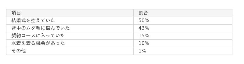 この結果から、背中の開いたドレスや水着など、肌の露出が増えるイベントをきっかけに、医療脱毛を検討・実施する傾向が高いことが分かります。