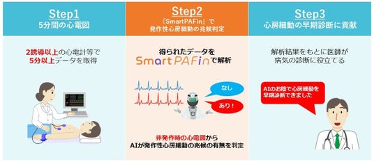 SmartPAFinは、発作の起きていないとき(以下、非発作時)の心電図から、7日以内*1の発作性心房細動の発作を予測することが可能になる、画期的な医療機器プログラム(SaMD:Software as a Medical Device)です。SmartPAFinを用いることで心房細動の早期発見・治療介入につながることを期待しています。当社の新サービスとして2025年度中に全国の医療機関への展開を予定しています。