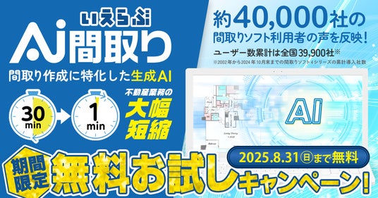 株式会社いえらぶGROUP(本社:東京都新宿区、代表取締役:岩名泰介、以下「いえらぶGROUP」)の子会社である株式会社ピーシーコネクト(本社:大阪府大阪市、代表取締役:武本光明、以下「ピーシーコネクト」)は、最短1分で間取りを自動生成するAIツール「いえらぶAI間取り」の無料お試しキャンペーン(※1)を開始したことをお知らせします。