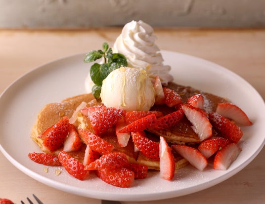 焼き立てふわふわのパンケーキに、フレッシュな苺とたっぷりのホイップクリーム、バニラアイスを添えてご提供。